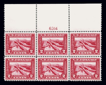 47 nhPB 398 image#398, 2c Panama-Pacific, full top margin plate no. 6314 block of six, gorgeous intense color and a prooflike impression on wonderfully bright paper, exceedingly well centered and margined throughout, o.g., n.h., trivial small selvage tear at top center, otherwise extremely fine; still one of the most eye-appealing full top examples of this plate we have ever encountered. (Image) $475.00