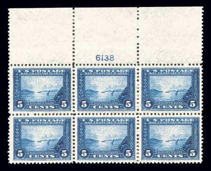 48 nhPB 399 image#399, 5c Panama-Pacific, an incomparable quality full top plate no. 6138 block of six, in the most amazing condition we have ever seen on this rare commemorative plate block, possessing every physical attribute that the most demanding condition conscious collector could ask for, brilliantly fresh and crisp, gorgeous rich color and impression on bright paper, incredibly well centered and margined throughout, strong intact perforations, immaculate o.g. without a single gum bend or skip, n.h., extremely fine; a superb plate block that is quite likely the finest full top example extant. (Image) $3,200.00