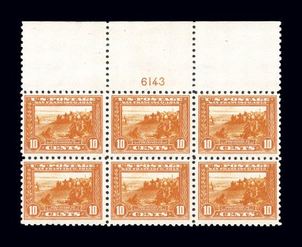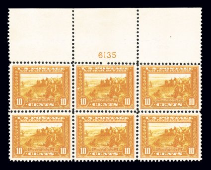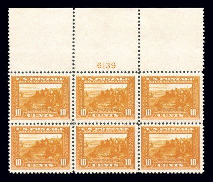 50 nhPB 400A image#400A, 10c Panama-Pacific, orange, a stunning quality full top margin plate no. 6139 block of six, this being not only one of the rarest plate blocks of the 20th century, but also one of the most challenging to find in premium condition, especially as a full top position such as this, incredibly fresh overall and possessing the most intense rich orange color imaginable, extraordinarily well centered and margined throughout, strong and intact perforations, immaculate o.g., never hinged, extremely fine overall; this remarkable never hinged full top example of this rarity is, unquestionably, one of the very finest available, potentially rivaled by only one other example which realized $38,500.00 (including premium) in a November 13, 2004 auction conducted by Matthew Bennett International (sale #283). (Image) $18,000.00