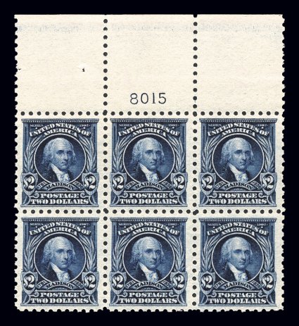 53 nhPB 479 image#479, $2.00 Dark blue, a gem full top margin plate no. 8015 block of six, incredibly fresh and intact, strikingly intense color and a prooflike impression on pristine paper, extraordinarily well centered and margined, unblemished o.g., n.h., extremely fine; this stunning plate block is, without question, the finest we have ever offered in our auctions and surely ranks among the finest extant, eclipsing in quality the choice example sold in our February 2005 sale of the collection of Dr. Frederick S. Fogelson, which realized a record $17,600.00 (including the buyer's premium). (Image) $6,500.00