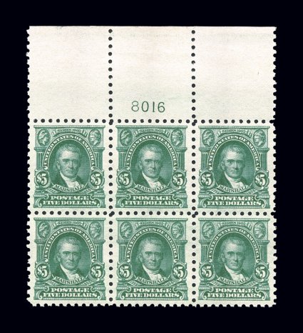 54 nhPB 480 image#480, $5.00 Light green, an incomparable quality full top margin plate no. 8016 block of six, in the most incredible condition imaginable for any plate block, let alone this high denomination rarity, as each and every aspect of this plate simply could not be improved upon, possessing mathematically perfect centering and each stamp boasting large margins, its color and impression would rival any proof, strong and fully intact perforations all around, immaculate o.g. without a single gum bend or skip, n.h., superb; a stunning never hinged full top plate block that is, without a doubt, the finest in existence. (Image) $5,000.00