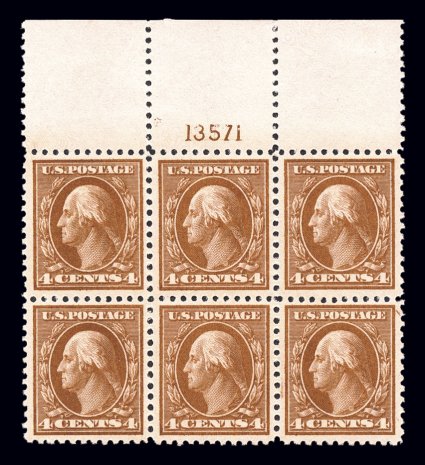 56 nhPB 503 image#503, 4c Brown, pristine full top margin plate no. 13571 block of six, sumptuously rich color and a crisp detailed impression on fresh paper, marvelously well centered, strong and intact perforations, immaculate o.g., n.h., extremely fine and quite choice. (Image) $225.00