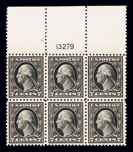 59 nhPB 507 image#507, 7c Black, full top margin plate no. 13279 block of six, particularly well centered for this surprisingly difficult plate block, prooflike color and impression on bright paper, strong and intact perforations, pristine o.g., n.h., extremely fine for this. (Image) $430.00