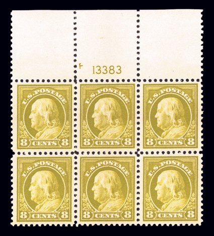 60 ogPB 508 image#508, 8c Olive bister, full top margin plate no. F 13383 block of six, rich luxuriant color and a strong impression, bright and fresh overall, well centered, o.g., five stamps n.h., bottom center stamp with barest trace of hinging, extremely fine; a particularly attractive and choice plate block. (Image) $140.00