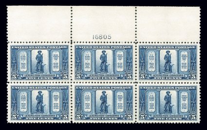 121 nhPB 619 image#619, 5c Lexington-Concord, full top margin plate no. 16805 block of six, each stamp within the plate possessing huge balanced margins, wonderfully fresh, rich color, o.g., n.h., bottom left stamp with natural paper wrinkle, extremely fine and handsome. (Image) $300.00