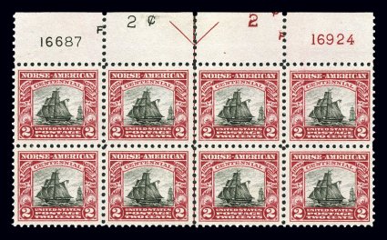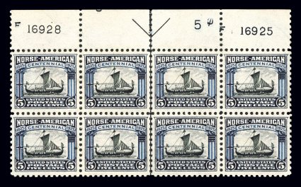 122 nhPB 620 image#620, 2c Norse-American, full top margin arrow and plate nos. 16687, 16924 block of eight, possessing an uncommonly wide sheet margin which is difficult to find on plate blocks of this issue, wonderfully bright and fresh, outstanding centering throughout, o.g., n.h., extremely fine; actually quite scarce in this gem condition. (Image) $290.00