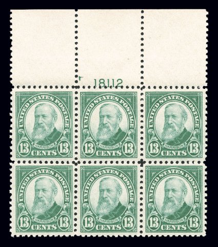 124 nhPB 622 image#622, 13c Green, striking full top margin plate no. 18112 block of six, in the finest condition possible, incredibly fresh and crisp, gorgeous bright color on immaculate paper, extraordinarily well centered and margined throughout, strong and intact perforations, o.g., n.h., extremely fine; a pristine gem; 2004 PF certificate; ex-"Silver Lake". (Image) $250.00