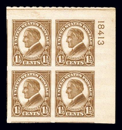 125 nhPB 631 image#631, 1 1/2c Yellow brown imperforate, striking top right corner margin plate no. 18413 block of four, huge well balanced margins all around, including showing just traces of the adjoining stamps, rich color, o.g., n.h., extremely fine gem. (Image) $80.00