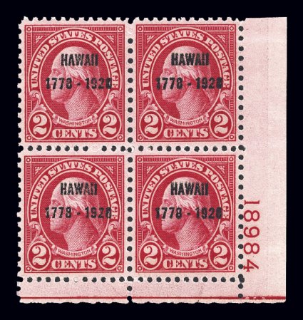127 nhPB 647 image#647, 2c Hawaii Sesquicentenial, bottom right corner margin plate no. 18984 block of four, extraordinarily well centered, deep radiant color, o.g., n.h., extremely fine; quite elusive to find so choice. (Image) $220.00