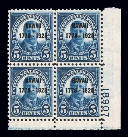 128 nhPB 648 image#648, 5c Hawaii Sesquicentennial, bottom right corner margin plate no. 18907 block of four, virtually perfectly centered which is quite a challenge to find on this difficult plate block, deep luxuriant color, pristine o.g., n.h., extremely fine gem. (Image) $425.00