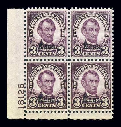 129 nhPB 661 image#661, 3c "Kans." ovpt., bottom left corner margin plate no. 18126 block of four, unusually well centered, deep rich color, o.g., n.h., extremely fine. (Image) $300.00