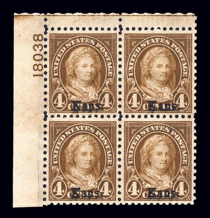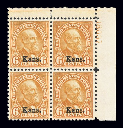 132 nhPB 664 image#664, 6c "Kans." ovpt., brilliant top right corner margin plate no. 18037 block of four, deep vivid color, outstanding centering for this scarce and challenging value, strong and intact, o.g., n.h., extremely fine; among the finest examples of this plate block we have ever offered. (Image) $650.00