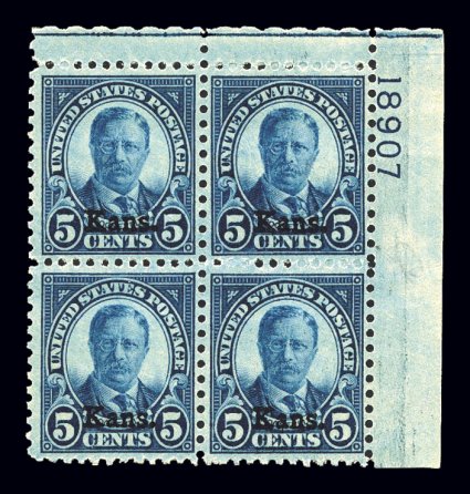 131 nhPB 663 image#663, 5c "Kans." ovpt., top right corner margin plate no. 18907 block of four, strong rich color, well centered, o.g., n.h., choice very fine. (Image) $210.00