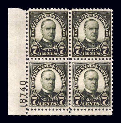 133 nhPB 665 image#665, 7c "Kans." ovpt., bottom left corner margin plate no. 18740 block of four, extraordinarily well centered throughout the plate, deep rich color, strong and intact perforations, immaculate o.g., n.h., extremely fine; an especially scarce and desirable plate block in such outstanding condition; 1976 PF certificate. (Image) $700.00