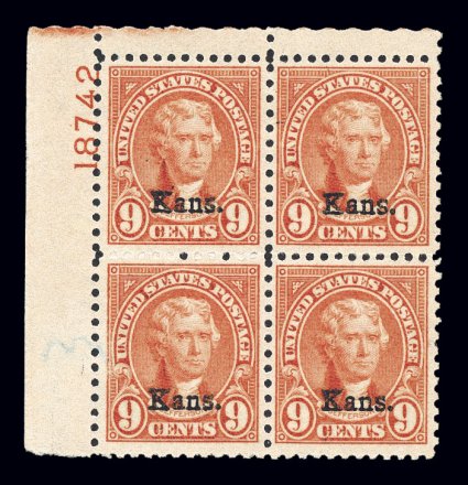 135 nhPB 667 image#667, 9c "Kans." ovpt., top left corner margin plate no. 18742 block of four, exceptionally well centered, rich vibrant color, unblemished o.g., n.h., extremely fine; 1991 PF certificate; ex-Morris. (Image) $350.00