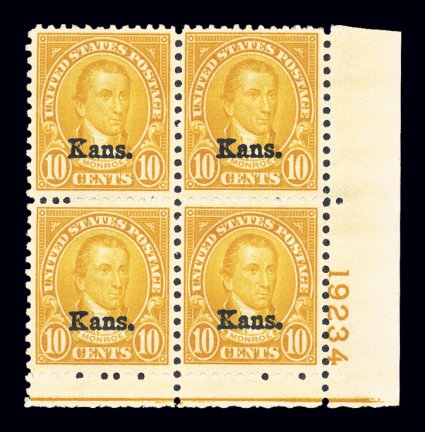 136 nhPB 668 image#668, 10c "Kans." ovpt., pristine bottom right corner margin plate no. 19234 block of four, sumptuously rich color, crisp and intact, well centered, o.g., n.h., choice very fine. (Image) $500.00