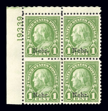 137 nhPB 669 image#669, 1c "Nebr." ovpt., top left corner margin plate no. 19339 block of four, incredibly well centered and margined, gloriously rich color, pristine o.g., n.h., extremely fine; despite being the lowest denomination of the set, this plate block is just as challenging to find in this gem condition as any of the other higher values. (Image) $70.00