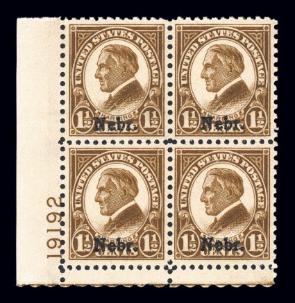 138 nhPB 670 image#670, 1 1/2c "Nebr." ovpt., a matchless quality bottom left corner margin plate no. 19192 block of four, possessing mathematically precise centering and each stamp with uncharacteristically large margins, deep rich color, pristine o.g., n.h., an extremely fine gem in every regard. (Image) $75.00