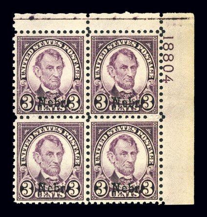 139 nhPB 672 image#672, 3c "Nebr." ovpt., top right corner margin plate no. 18804 block of four, well centered, rich color, strong and intact, o.g., n.h., choice very fine. (Image) $250.00