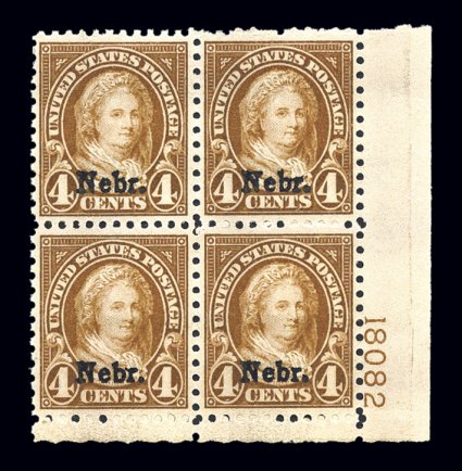 140 nhPB 673 image#673, 4c "Nebr." ovpt., bottom right corner margin plate no. 18082 block of four, extraordinarily well centered, deep rich color, immaculate o.g., n.h., extremely fine. (Image) $350.00