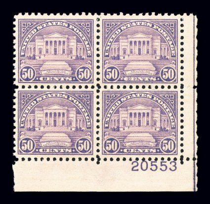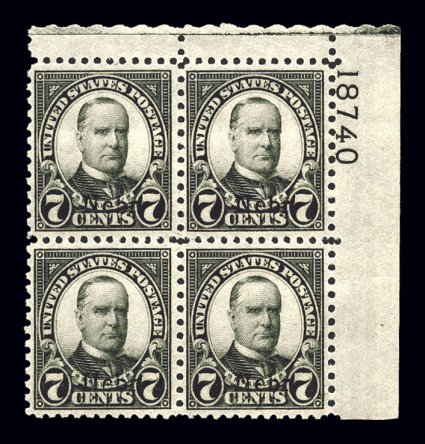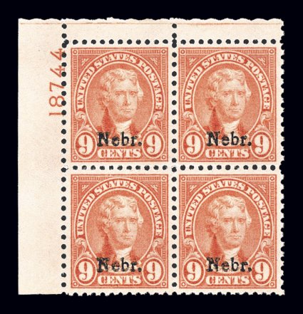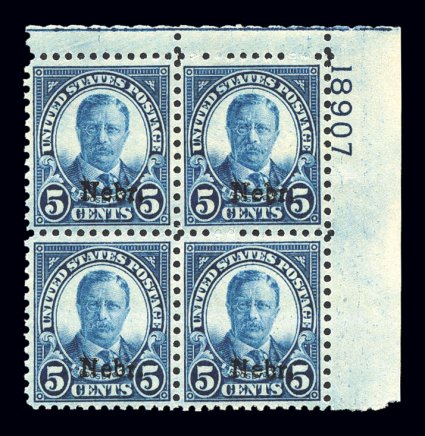 141 nhPB 674 image#674, 5c "Nebr." ovpt., top right corner margin plate no. 18907 block of four, unusually well centered, deep rich shade, inatct perforations all around, o.g., n.h., extremely fine. (Image) $275.00