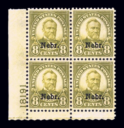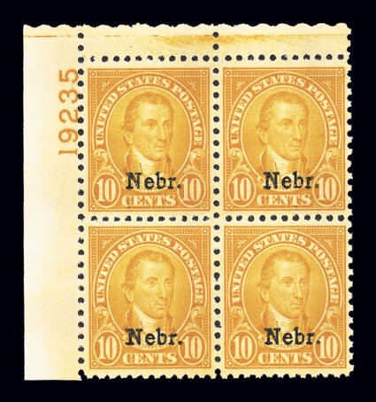 145 nhPB 679 image#679, 10c "Nebr." ovpt., striking top left corner margin plate no. 19235 block of four, fabulously fresh and crisp, featuring incredibly intense color, exceedingly well centered, fully intact and strong perforations, pristine o.g., n.h., a very fine and wonderfully choice example of this key plate block; 1998 PF certificate. (Image) $1,300.00
