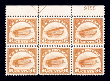 148 nhPB C1 image#C1, 6c Orange, an incredibly choice full top margin arrow and plate no. 9155 block of six, being a condition that far surpasses most examples encountered of this scarce air post plate block, brilliantly fresh, intense vibrant color without any of the usual oxidization so often found, exceptionally well centered and margined throughout, strong and intact perforations, pristine o.g., n.h., extremely fine. (Image) $1,050.00