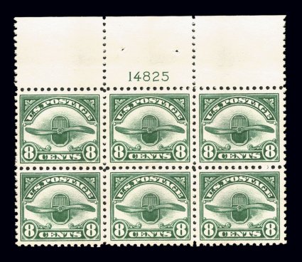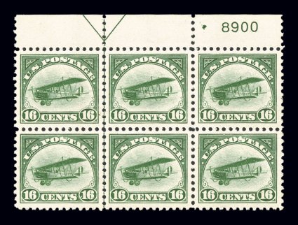 149 nhPB C2 image#C2, 16c Green, an impressive full top margin arrow and plate no. 8900 block of six, each stamp within the plate is incredibly well centered within large margins, prooflike color and impression on extraordinarily bright paper, strong and intact, o.g., n.h., extremely fine; a superb never hinged #C2 plate block whose equal would be quite a challenge to locate. (Image) $1,500.00