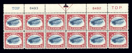 150 nhPB C3 image#C3, 24c Carmine rose and blue, pristine full top margin arrow, double "TOP" and plate nos. 8493, 8492 block of twelve, possessing exceptional overall physical qualities which places it among the finest examples of this scarce air post plate block we have ever offered, gorgeous intense colors and strong impressions on brilliantly fresh paper, incredibly well centered and margined throughout the plate (which is quite a challenge to find), strong and intact, o.g., n.h., extremely fine. (Image) $2,000.00