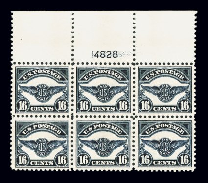 152 ogPB C5 image#C5, 16c Dark blue, full top margin plate no. 14828 block of six, an especially handsome example of this scarce plate block, featuring a wide sheet selvage and excellent overall centering, deep luxuriant color and impression on bright paper, o.g., stamps n.h., faintly hinged only in the ungummed portion of the sheet selvage, very fine and exceedingly choice. (Image) $1,550.00