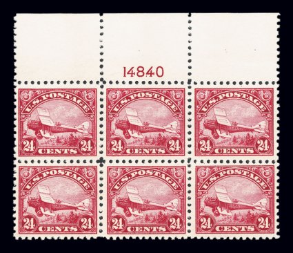 153 nhPB C6 image#C6, 24c Carmine, a fabulously fresh and choice full top margin plate no. 14840 block of six, being in a true "post office" state of preservation, gorgeous prooflike color and impression on bright white paper, extraordinarily well centered and margined throughout, crisp and intact perforations, pristine o.g., n.h., extremely fine: the finest never hinged full top example of this air post plate block we have ever offered. (Image) $3,100.00
