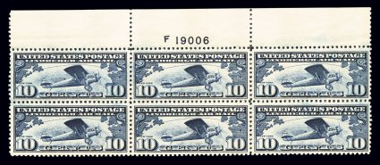 154 nhPB C10 image#C10, 10c Lindbergh, full top margin plate no. F 19006 block of six, exceptionally well centered, deep rich color, o.g., n.h., extremely fine; actually quite elusive to find as a premium quality full top plate block. (Image) $130.00