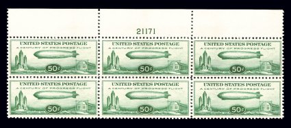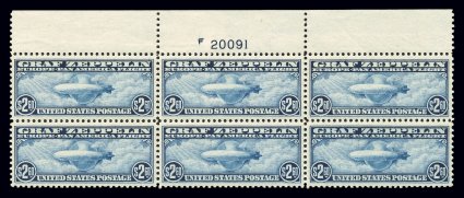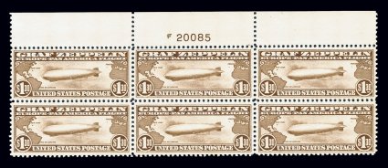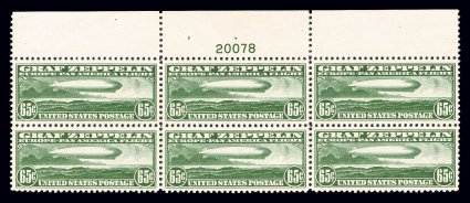 156 nhPB C18 image#C18, 50c Graf Zeppelin, full top margin plate no. 21171 block of six, incredibly well centered, brilliantly fresh and intact, o.g., n.h., extremely fine. (Image) $700.00