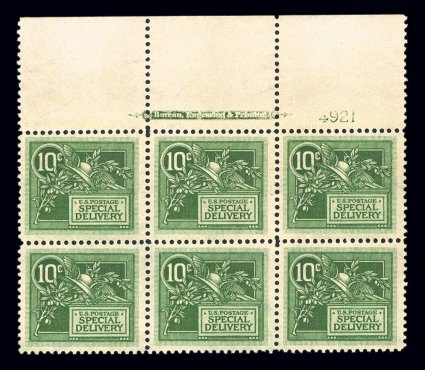 157 nhPB E7 image#E7, 10c Green, an exceptional quality full top margin imprint and plate no. 4921 block of six, exceptionally well centered, deep luxuriant color and a crisp impression, strong and intact perforations, pristine o.g., n.h., extremely fine; 1983 PF certificate. (Image) $1,300.00