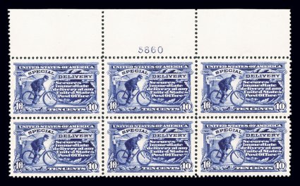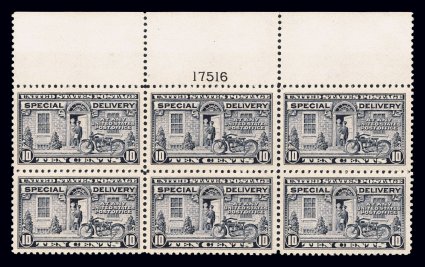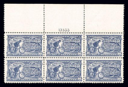 159 nhPB E11 image#E11, 10c Ultramarine, striking full top margin plate no. 13555 block of six, featuring not only an extra-large sheet selvage, but its overall centering is outstanding, with large even margins on each of the stamps, deep luxuriant color and impression on bright paper, o.g., n.h., extremely fine; a particularly handsome and choice plate block. (Image) $325.00