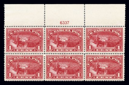 161 nhPB Q1 image#Q1, 1c Parcel Post, pristine full top margin plate no. 6337 block of six, strikingly intense and radiant color, extraordinarily well centered and margined, o.g., n.h., extremely fine; an especially choice full top example of a seldom offered plate block (Image) $180.00