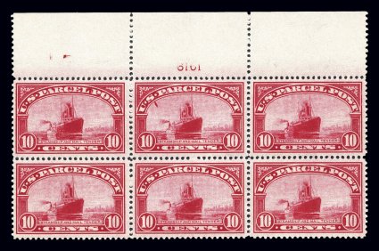 162 nhPB Q6 image#Q6, 10c Parcel Post, full top margin plate no. 6161 block of six, extraordinarily fresh and crisp, deep "fiery" color and a strong impression on bright paper, well centered, o.g., n.h., very fine and quite choice; the first premium quality full top example of this rare plate block we have ever offered. (Image) $1,650.00
