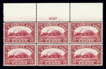 163 nhPB Q11 image#Q11, 75c Parcel Post, full top margin plate no. 6287 block of six, in a most remarkable state of preservation, brilliantly fresh and crisp, deep "fiery" color and a well incised impression on bright paper, exceptionally well centered, immaculate o.g. without a single gum bend or skip, n.h., a very fine and exceedingly choice example of a this rare and seldom offered Parcel Post plate block. (Image) $4,500.00