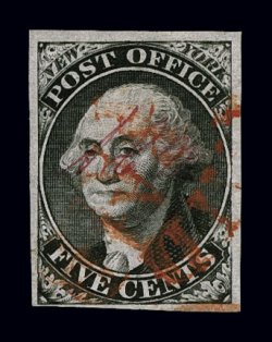 501 O 9X1b image#9X1b, New York, N.Y. 5c Black Postmaster Provisional, signed A.C.M., a visually striking used example, featuring large margins virtually all around, deep rich color and impression, and beautifully postmarked with gorgeous multiple strikes of a red "PAID" cancel, extremely fine; 1994 PF certificate. (Image) $750.00