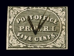 502 O 10X1 image#10X1, Providence, R.I. 5c Gray black Postmaster Provisional, used, three large margins, just into frame line at top, crisp impression, ms. check mark which all known used examples have, fine; used examples of this Postmaster Provisional are rarely offered; 2004 PF certificate. (Image) $1,750.00