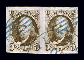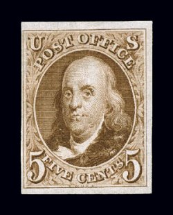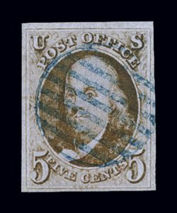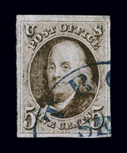 503 O 1 image#1, 5c Red brown, gem used example with four exceptionally large and wonderfully well balanced margins, tied to piece of cover by a clear strike of an exceptionally scarce blue "STEAM" in circle cancel, plus a strike of matching blue circular grid, strong bright color with a sharp impression, extremely fine; an especially desirable and eye-appealing example of the Five Cent 1847 Issue; 1984 PF certificate. (Image) 750.00