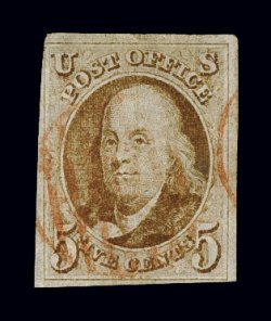 506 O 1 image#1, 5c Red brown, used, large margins all around except close at the top left corner, fine impression, red grid cancel, tiny fault in the top margin, very fine apperance. (Image) $550.00