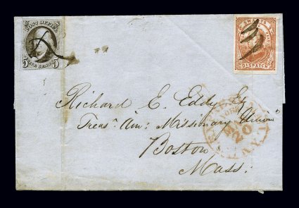 508 c 1, 136L4 image#1, 136L4, 5c Red brown and 2c Red Swarts' City Dispatch Post, on 1850 folded cover to Boston, 5c Red brown with three large margins, just into the frame line at bottom (file fold barely affecting the right margin), tied by ms. crossed lines, 2c Swarts' with four large margins, neat central ms. cancel, right file fold through the stamp, red "U.S. Express Mail/N.Y./N. York/May 20" c.d.s. below, very fine appearance; an extremely rare usage, every aspect of which was to expedite speedy service by use of the private carrier service in New York and the railway U.S. Express service between New York and Boston, docketing specifying that $100.00 was enclosed gives the reason for this extraordinary service; this local is one of the very few local issues listed by Scott as known used with the 5c 1847 Issue but unpriced; signed by William O. Bilden sometime in the 1960's as guaranteed from an original find that he made. (Image) Est. 750-1,000