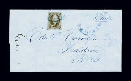 509 c 1 image#1, 5c Red brown, four margins, close at top, other margins large, strong rich color and impression, tied by blue Philadelphia c.d.s. on blue folded cover to Providence, R.I., light vertical file folds not affecting the stamp, cover with a couple trivial bleach spots, stamp itself is fresh and very fine. (Image) $685.00