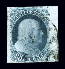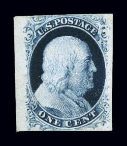 515 og 9 var. image#9 var., 1c Blue, Ty. IV, recut twice at top and twice at bottom, position 79L1L, a gem mint example of the rarest of all the recut varieties (only two positions of the sheet were recut in this manner), possessing an extraordinary overall freshness, with strikingly intense color and an outstanding impression on bright paper, its margins are uncommonly large and symmetrical, full clean o.g., lightly hinged, extremely fine; a highly desirable copy not only as a premium quality mint #9, but whose recutting variety enhances its scarcity even further; 1998 PF certificate; ex-Floyd. (Image) $900.00
