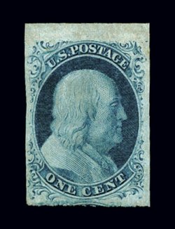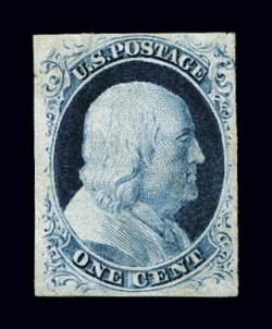 513 og 9 image#9, 1c Blue, Ty. IV, position 2R1L, an impressive mint single, featuring extra-large to enormous margins all around including a sizeable portion of the sheet margin at top and a portion of the adjoining stamp at bottom, brilliantly fresh and crisp, with truly prooflike color and detailed impression, full clean o.g., lightly hinged, extremely fine; a gem example for the connoisseur; 1988and 2002 PF certificates. (Image) $850.00