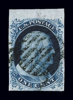 514 O 9 image#9, 1c Blue, Ty. IV, handsome used single, full to large margins all around including a huge top sheet margin, incredibly intense rich color and a deeply etched impression on fresh paper, light grid cancels, an extremely fine stamp with great eye appeal; 2004 PF certificate. (Image) $130.00