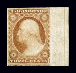 516 og 11 image#11, 3c Dull red, plate 4, gem mint right sheet-margin single with center line, other margins are large to huge as well, showing small portions of the adjoining stamps at top and bottom, strong dull red color in a much deeper shade than usual, full, though slightly disturbed, o.g., extremely fine; while not rare, there were about half the stamps produced from plate 4 as from any one of plates 1, 2 or 3, and the center line has the widest spacing of any of the plates, making select mint position examples, as this, particularly scarce. (Image) $300.00
