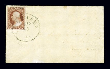 517 11 var. image#11var., 3c Dull red, major cracked plate variety, position 94L5, four-margin example, just clear at top to extra-large margins on the other three sides, tied to petite cover to Open Pond, Alabama by Columbus (Ga?) c.d.s., very fine; this is the best position showing the largest of any cracks on the 3c 1851-57 Issues, with the crack clearly showing the vertical length of the stamp from the bottom selvage, through the bust and out the top between the "G" and "E" of postage; an exceptionally desirable example on cover. (Image) Est. 150-200