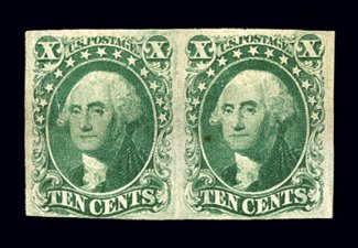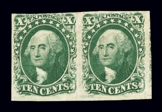 518 ng 14 image#14, 10c Green, Ty. II, unused horizontal pair, large margins all around except just into the design at the top of the left stamp, rich color and a sharp impression, fine-very fine; any unused pair of this stamp is rare, but to find one without faults is especially challenging; 2004 PF certificate; cataloged as two singles. (Image) $4,000.00+